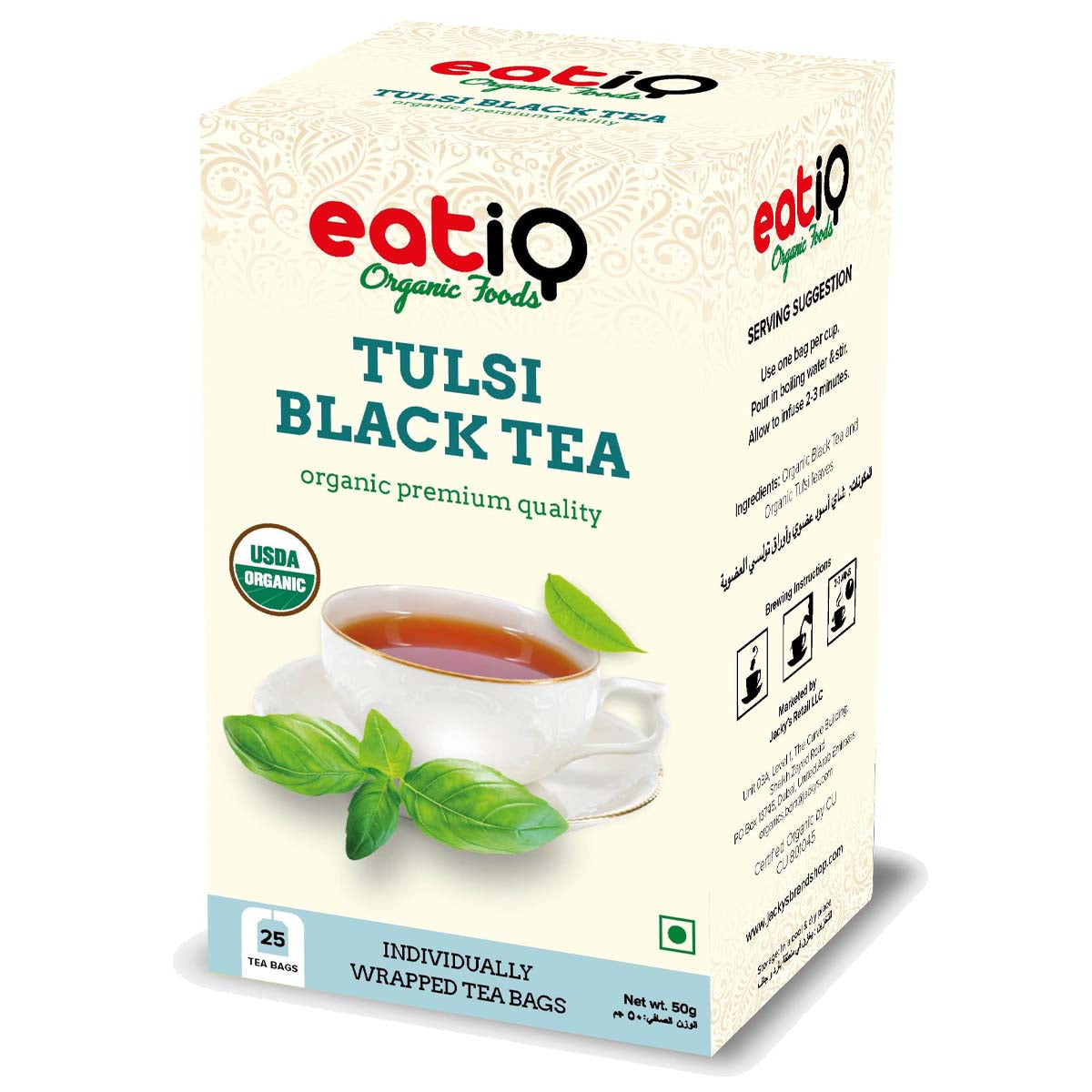 يجمع شاي التولسي الأسود من Eatiq Organic Foods بين المذاق التقليدي للشاي الأسود وفوائد التولسي الأيورفيدا، المعروف أيضًا باسم "إكسير الحياة". يحتوي هذا المنتج على 25 كيس شاي، كل منها مملوء بمكونات عضوية 100%. الشاي عضوي معتمد من وزارة الزراعة الأمريكية، وغير معدل وراثيًا، وحلال. وهو خالي من منتجات الألبان والجلوتين والقمح والمكسرات وفول الصويا والكافيين.