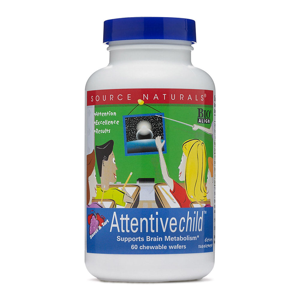 Source Naturals Attentive Child is a dietary supplement designed to support cognitive function in active children. Each bottle contains 60 chewable wafers, formulated to provide essential nutrients for brain health.