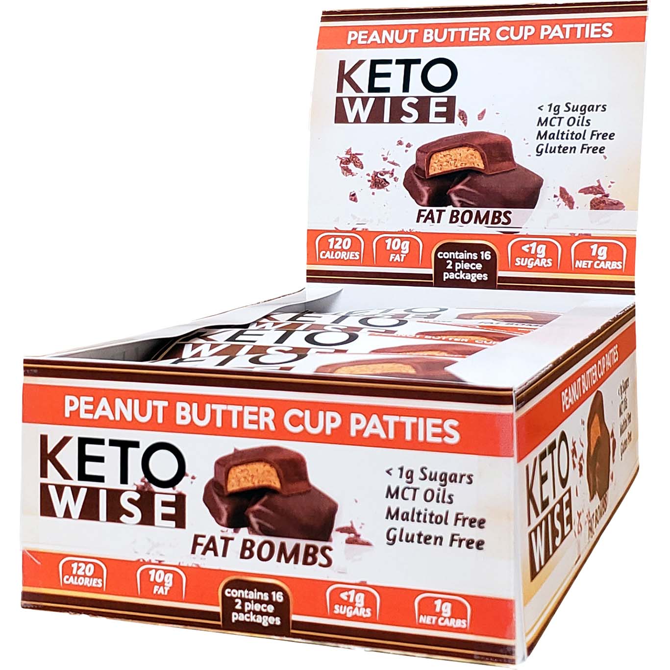 Keto Wise Fat Bombs, Peanut Butter Cup Patties, are specially designed candies that target 75% of their calories from fat. Each box contains 16 packages, with each package holding two 34g pieces. These fat bombs are formulated with a unique chocolate blend containing MCT oil, which supports optimal keto results.