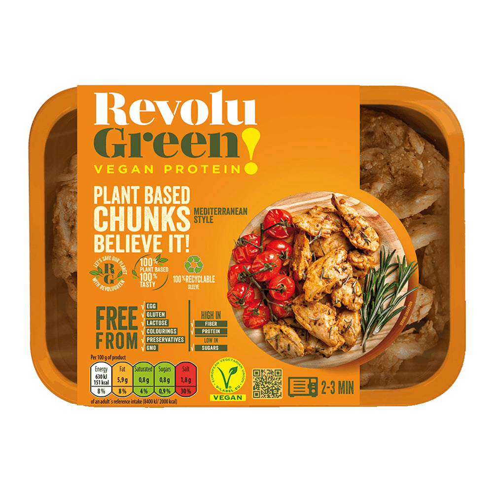Revolu Green Mediterranean Chunks are packaged in a 160 Gm size, offering a convenient portion for meal preparation. The product is designed to be easy to use and integrate into various recipes, providing a plantbased alternative without compromising on taste or texture.
