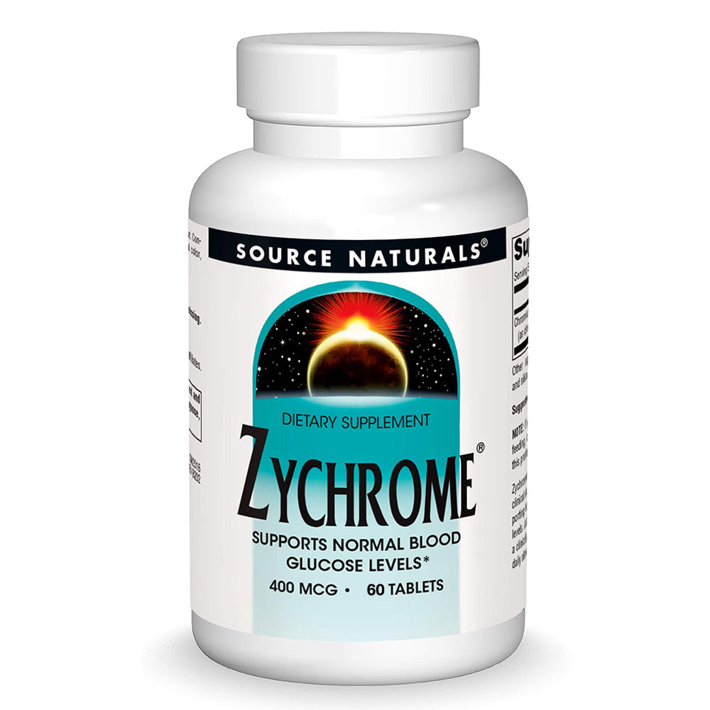 Source Naturals Zychrome, 400 mcg, 60 Tablets, is a dietary supplement designed to support healthy insulin sensitivity and normal blood glucose levels. This product features a patentpending form of trivalent chromium, an essential trace element. Each tablet provides 400 mcg of chromium, which is a clinically studied amount and exceeds the recommended daily allowance for this nutrient.