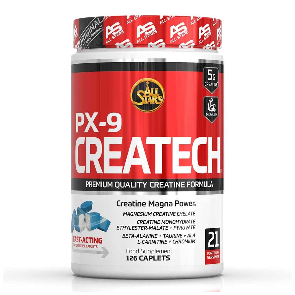 ALL STARS CreaTech PX9 is a highperformance supplement designed for athletes seeking to enhance their training sessions. This product contains 126 caplets, each formulated to boost phosphocreatine levels in muscles, thereby increasing ATP (adenosine triphosphate) production. Elevated ATP levels provide additional energy, essential for highintensity workouts.