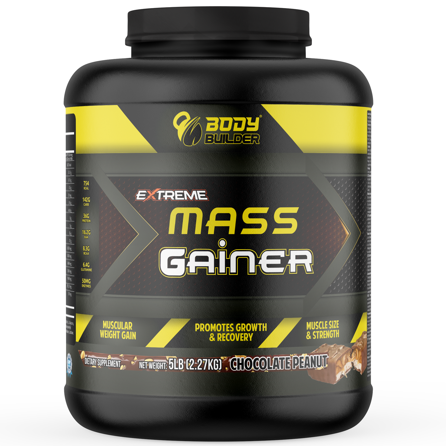 Body Builder Extreme Mass Gainer, Chocolate Peanut, 5 LB, is a premium supplement designed to support muscle mass increase and weight gain for trainers. This product provides concentrated whey protein, essential for muscle growth and recovery. It is rich in calories, protein, carbohydrates, and amino acids, which are crucial for muscle mass development and maintenance.