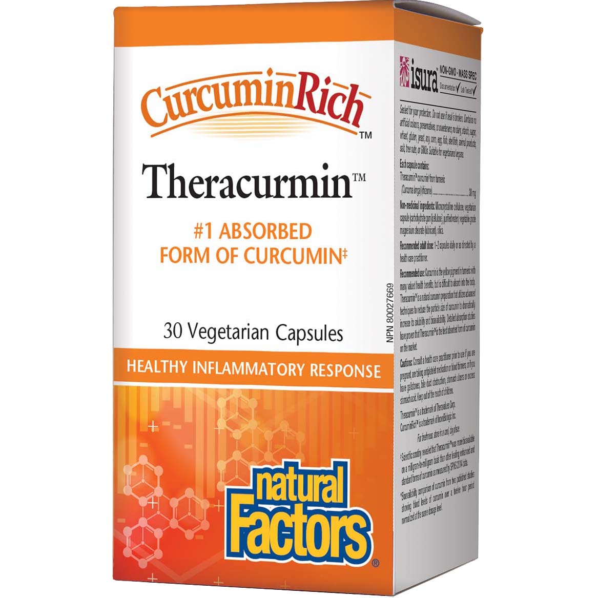 Natural Factors CurcuminRich Theracurmin provides 30 mg of curcumin per capsule, derived from the turmeric plant. Curcumin is known for its antioxidant and antiinflammatory properties. This supplement is designed to support overall health by offering multiple benefits.