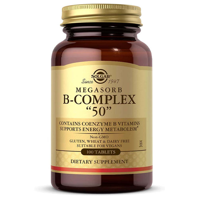 Solgar Megasorb BComplex 50, 100 Tablets, is a high potency, balanced Vitamin BComplex designed for improved absorption. It delivers key B vitamins, including Thiamine (B1), Riboflavin (B2), Niacin (B3), Pantothenic Acid (B5), and Vitamin B6, along with Folic Acid, Biotin (B7), and Vitamin B12. These essential nutrients help convert food into energy, supporting daily energy levels and mental performance. B vitamins are watersoluble and necessary for maintaining energy and general vitality. They also support the immune system, nervous system, and psychological functions.